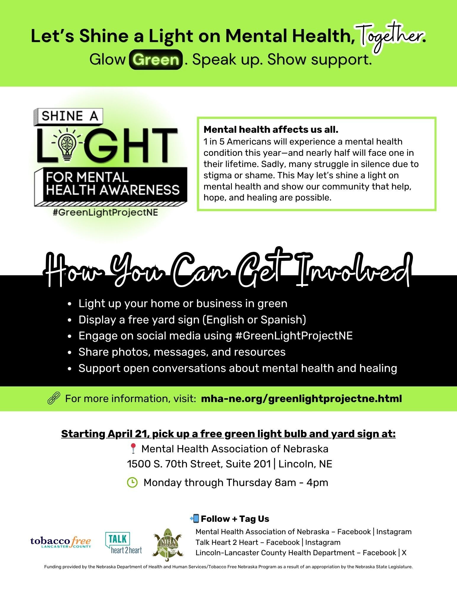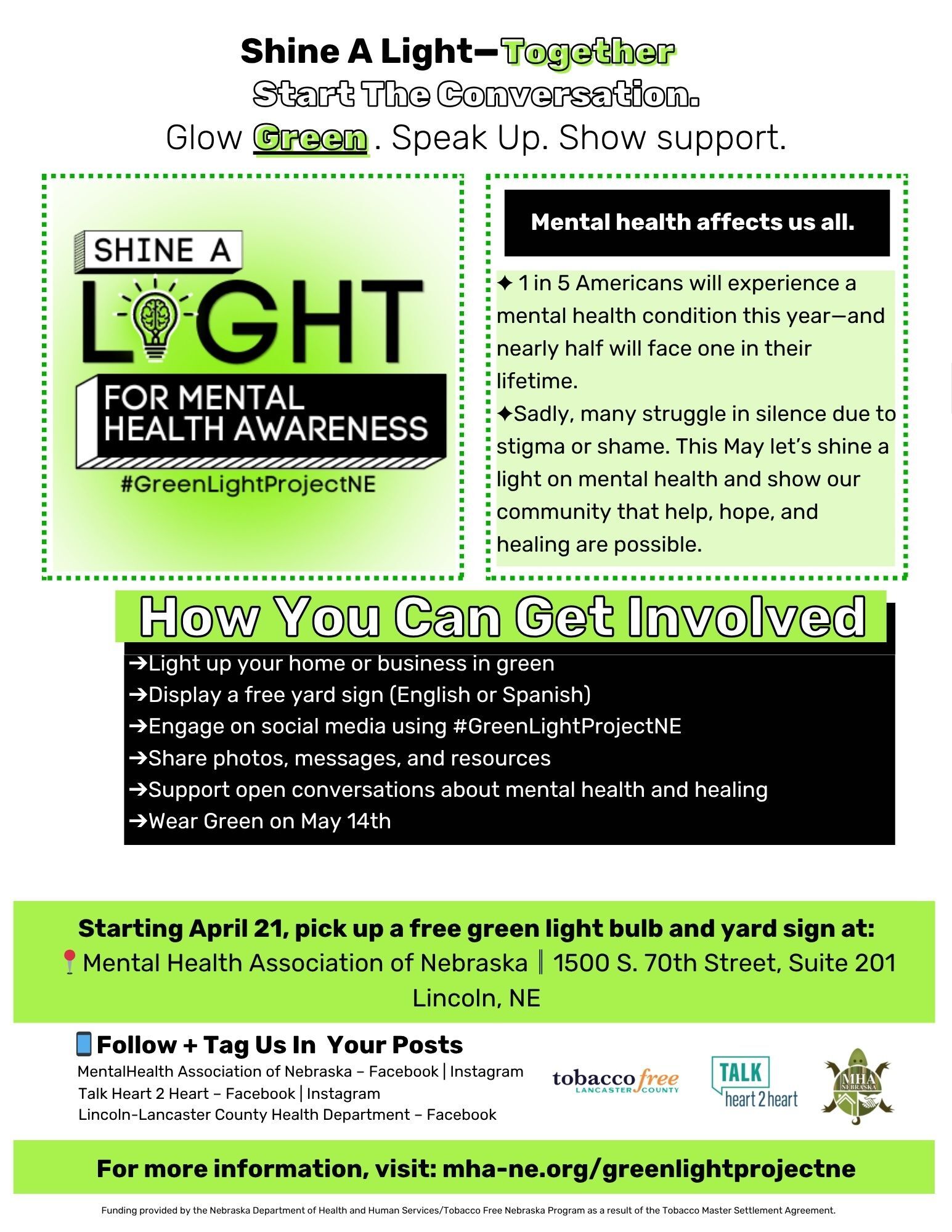 The Mental Health Association of Nebraska, Lancaster County Prevention Coalition, and Tobacco Free Lancaster County are partnering for a month-long campaign to raise awareness about mental health. And we invite you to join us!